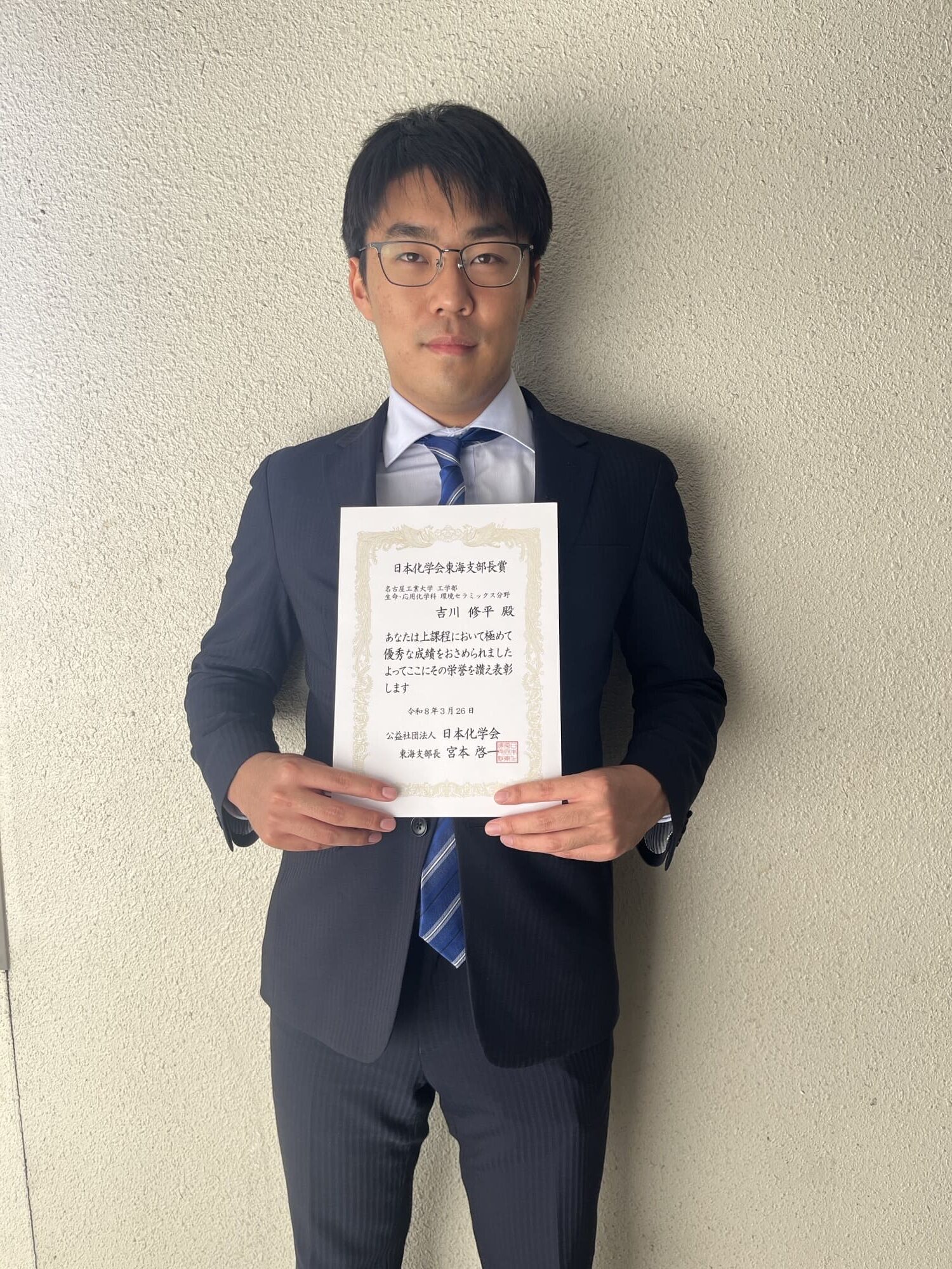 B4の吉川修平さんが日本化学会東海支部長賞を受賞しました。